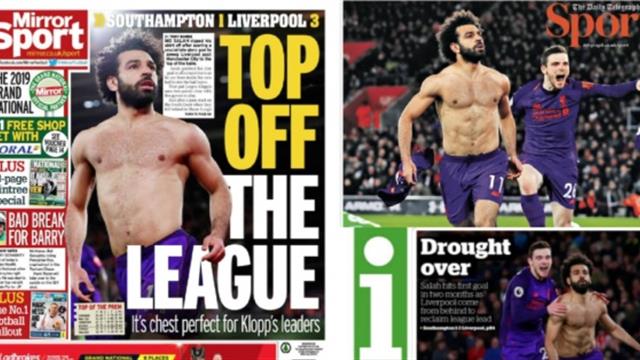 ميرور سبورت: "صلاح يعود بليفربول لقمة البريميرليج، مو يخلع قميصه بعد إحرازه لهدف رائع قاد به فريقه للصدارة مرة أخرى".