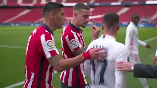 التقطت الكاميرات المتابعة من قبل شبكة "موفيستار" الإسبانية لأحداث مباراة الديربي بين ريال مدريد وأتلتيكو مدريد حوارًا جدليًا دائرًا بين الثنائي لويس سواريز ولوكاس فاسكيز بعد نهاية الشوط الأول.