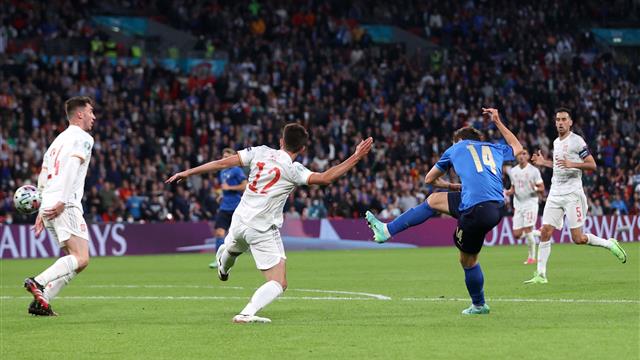 تقدم منتخب إيطاليا بهدف في مباراته الجارية حاليًا ضد إسبانيا، في بطولة كأس أمم أوروبا.