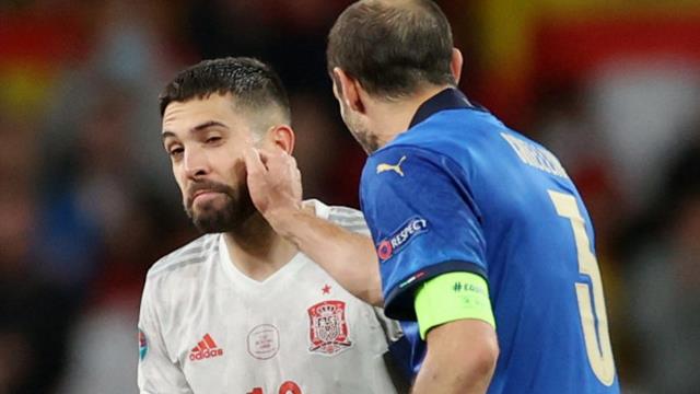 لم يبد أن ألبا معجب بسلوك كيلليني حيث عانق على مضض اللاعب البالغ من العمر 36 عامًا قبل أن ينضم مرة أخرى إلى زملائه في إسبانيا.
