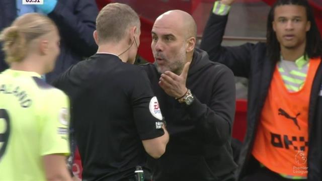 وانفعل جوارديولا واحتج مطالبًا بركلة جزاء لفريقه مانشستر سيتي لصالح لاعبه إيرلينج هالاند.