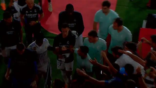 أفيلا لاعب أوساسونا، الذي كان متجهًا أيضًا نحو نفق غرفة تغيير الملابس لاحق فينيسيوس، وتدخل لوكاس فاسكيز لتهدئة اللاعبين.