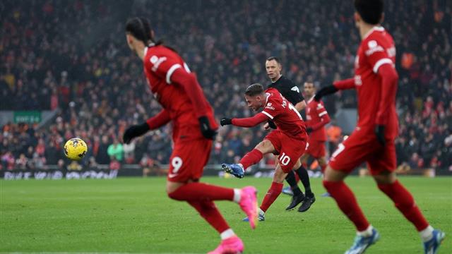 سجل الدولي الأرجنتيني أليكسيس ماك اليستر، لاعب فريق كرة القدم الأول بنادي ليفربول، الهدف الثاني للريدز في مرمى فولهام.