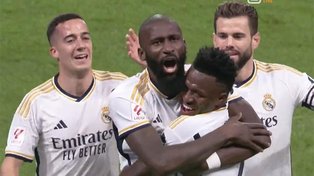 الهدف جاء بعد عرضية من مودريتش حولها روديجير ولكن تصدى لها الحارس لتجد فينيسيوس على مرتين ليسجل الهدف الأول من داخل منطقة الجزاء.