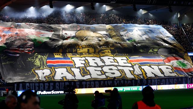 ورفعت جماهير باريس سان جيرمان لافتة كُتب عليها "فلسطين حرة"، ويظهر عليها خريطة فلسطين وعلم لبنان بالجوار.