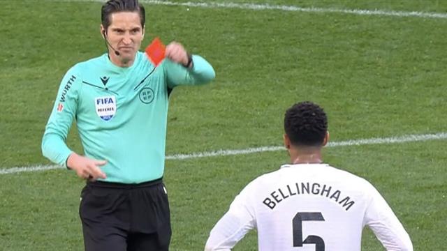 وأشهر حكم المباراة بطاقة حمراء لـ جود بيلينجهام في الدقيقة 40 من اللقاء، ولم يتضح السبب بعد.