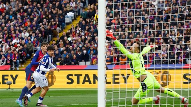 هدف برشلونة الأول جاء عن طريق جيرارد مارتين في الدقيقة 25 بعد مراوغة رائعة من لامين يامال لمدافع سوسيداد، ثم عرضية من داني أولمو، ليسددها الظهير الأيسر بقوة في شباك النادي الباسكي.
