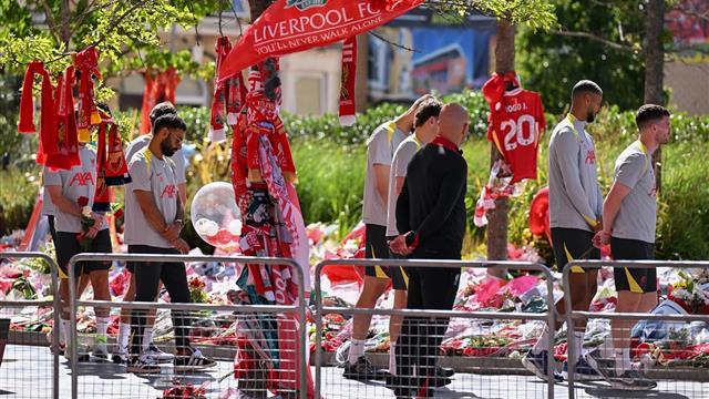 ومن ضمن اللاعبين الذين ظهروا وهم يتجهون بالزهور ناحية الساحة، كان محمد صلاح، الذي نعى جوتا بكلمات مؤثرة يوم الجمعة الماضي (لمطالعة التفاصيل من هنا).